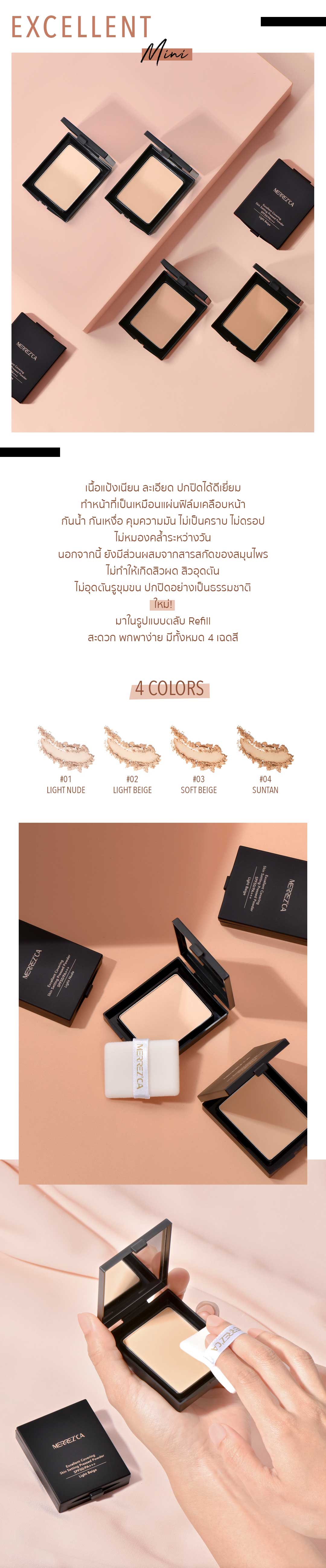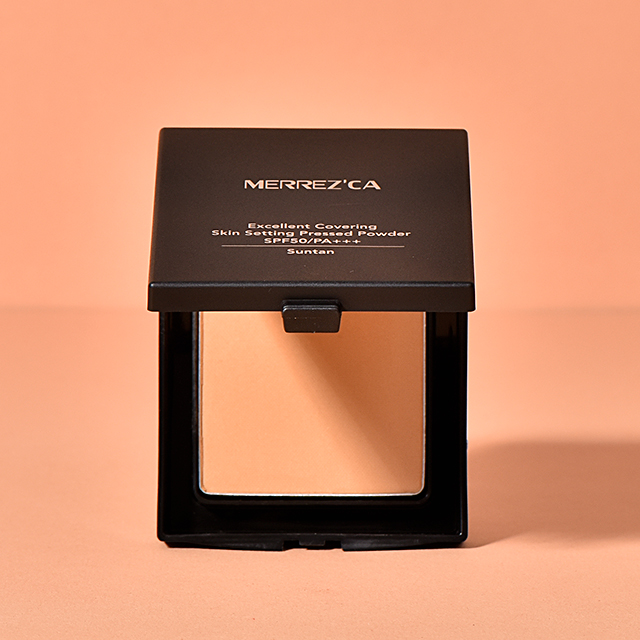 Merrezca Excellent Coveing Skin Setting Pressed Powder SPF50/PA+++ แป้งผสมรองพื้นอัดแข็ง เนื้อนุ่มละเอียดปกปิดได้ถึงระดับ Full-coverage ติดทนกันน้ำกันเหงื่อ และให้ผิวที่เรียบเนียนเป็นธรรมชาติไม่หมองคล้ำและสีไม่ดรอประหว่างวัน อีกทั้งยังช่วยคุมมันได้ดี สามารถเติมได้ตลอดหากต้องการโดยไม่ต้องกังวลเรื่องการอุดตันเพราะมีส่วนผสมจากสารสกัดของสมุนไพร ไม่ทำให้เกิดการระคายเคืองรูขุมขน รวมถึงมีส่วนผสมของ CHAMOMILLA RECUTITA FLOWER EXTRACT หรือสารสกัดจากดอกคาโมไมล์ ที่จะช่วยปลอบประโลมผิว จากการอักเสบจากสิว อีกทั้งยังยังมี ROSA CENTIFOLIA FLOWER EXTRACT สารสกัดจากกุหลาบ ตัวช่วยในเรื่องลดริ้วรอย รวมถึงชะลอการเสื่อมสภาพของเซลล์ผิว และยังช่วยปกป้องผิวของคุณจากแสงแดดด้วย SPF 50/PA+++ มีให้เลือก 4 เฉดสี